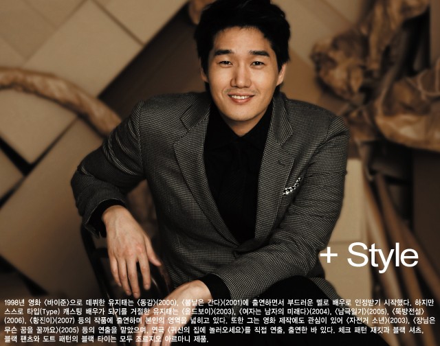 <아레나>는 A-어워드 스타일 부문 수상자로 배우 유지태를 선정했다. 모델 출신인 그에게 이번 수상은 너무나도 당연하게 느껴질 것이다. 하지만 여기서 다시 한 번 ‘스타일’의 정의에 대해 곱씹어본다면, <아레나>의 선정 이유가 단지 그의 외형 때문만이 아님을 금방 눈치 챌 수 있을 것이다. 올 한 해 유지태는 <황진이>로, 본인의 영화 제작으로, 연극으로 쉴 틈 없는 시간을 보내왔다. 하지만 업적보다 먼저 다가오는 것은, 올 한 해 역시 ‘유지태는 유지태 스타일대로 움직여왔다’는 사실이다. 반짝이는 스타가 되기를 온전히 거부한 배우. 오히려 그보다는 조금 더 뭉근한 느낌으로 지르밟기를 선택한 배우가 바로 유지태다. 언제나 그러했지만, 오늘도 유지태는 본인만의 느릿한 말투로 이야기하고 있다. 그리고 올 한 해 역시 그는 세상의 소음과는 상관없이 배우로서, 감독으로서 조용한 결과물을 만들어냈다. 그래도 대중 예술을 하는 사람인데, 조금 더 화려해야 하지 않겠냐고? 물론 맞는 말이다. 하지만 사람의 생김새가 다 다르듯, 대한민국 영화계에도 이런 스타일을 지닌 배우가, 감독이 하나쯤은 있어줘야 마땅하다. 조금 천천히 가는 사람은, 그런 만큼 많은 걸 체득하게 되어 있다. 빨리 걷는 사람들이 알지 못하는 공기 내음을 그들은 천천히 걷기에 맡을 수 있다. 유지태는 그런 배우다. 대나무처럼 올곧은 소신을 가진 배우, 남들보다 느린 속도로 걷고, 얘기하고, 행동하는 배우. 그게 바로 유지태요, 유지태 스타일이다.