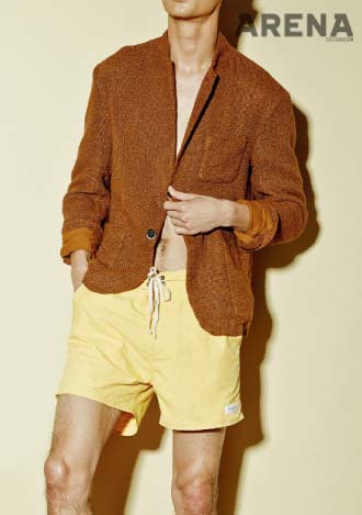 리넨이나 헴프 등 거친 소재로 짠 재킷을 카디건처럼 입는다. 단정함은 최대한 버린다. 투 버튼 재킷 74만3천원 바레나 by 샌프란시스코 마켓, 병아리색 수영복 11만5천원 새터데이 서프 by 플랫폼 플레이스 제품.