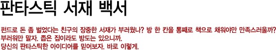 펀드로 돈 좀 벌었다는 친구의 장중한 서재가 부러웠나?방 한 칸을 통째로 책으로 채워야만 만족스러울까?부러워만 말자. 좁은 집이라도 방도는 있으니까.당신의 판타스틱한 아이디어를 믿어보자. 바로 이렇게.<br><br>[2006년 8월호]