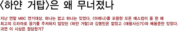 지난 연말 MBC 연기대상. 하나는 없고 하나는 있었다. <아레나>를 포함한 모든 매스컴이 올 한 해 최고의 드라마로 꼽기를 주저하지 않았던 <하얀 거탑>과 김명민은 없었고 <태왕사신기>와 배용준만 있었다.과연 이 시상은 정당한가?<br><br>[2008년 2월호]