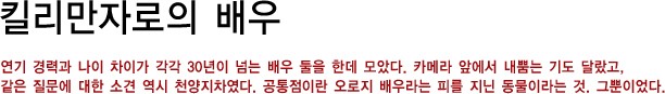 연기 경력과 나이 차이가 각각 30년이 넘는 배우 둘을 한데 모았다. 카메라 앞에서 내뿜는 기도 달랐고, 같은 질문에 대한 소견 역시 천양지차였다. 공통점이란 오로지 배우라는 피를 지닌 동물이라는 것. 그뿐이었다. <br><br>[2009년 2월호]