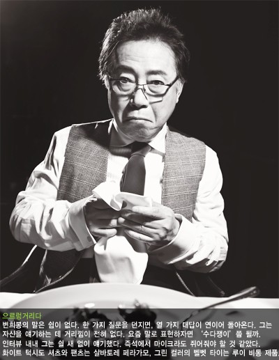 “우리 영화에서 나뿐만 아니라 이혜영 씨, 손현주 씨, 이은성 씨 등등 배우들이 얼마나 혼신을 다해 연기했는지 몰라요. 사실 나는 조연인 거지. 잘 좀 써주세요, 기자 양반.” 개봉을 앞두고 걱정이 많은 사람은 역시나 변희봉이었다. 60대 중반을 넘긴 나이 지긋한 이 노년의 배우는 손녀뻘 되는 기자에게 연신 잘 부탁드린다는 말을 반복했다. 모든 일에 걱정이 먼저 앞서는 노인 특유의 ‘노파심’ 때문이다. “필(筆) 하나로 관객이 몇 떨어지고, 몇 들어오는 차이가 있을 것 아닙니까. 잘 좀 부탁드릴게요.” 인터뷰 자리를 뜨면서도 그는 ‘신신당부’를 잊지 않았다. 연기 경력 42년. 결과에는 연연하지 않는다는 듯 너털웃음을 지어 보일 줄 알았건만, 의외였다. 변희봉은 막 잡아 올린 팔팔 뛰는 생선 같았다. 그는 ‘나이를 먹어도 배우로서의 욕심은 그대로인 것’이라 말했다.
