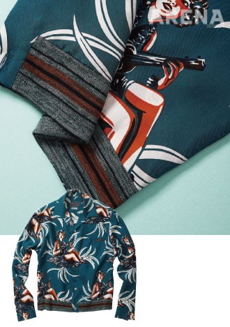 석양을 배경으로 우쿨렐레를 연주하는 하와이언 미녀가 그려진 실크 셔츠다. 분명 셔츠인데, 밑단에 예사롭지 않은 밴드가 붙어 있다. 블루종과 셔츠의 경계에 선 옷이다. 이 옷을 입을 땐 밑단을 꺼내란 뜻이겠지? 80만원대.