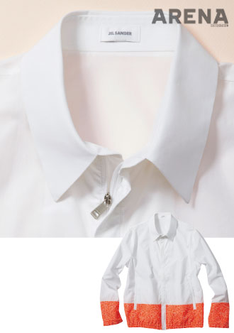 기본적인 흰색 셔츠와 짧은 바람막이 점퍼가 섞인 옷이다. 정갈한 칼라 사이로 드러난 지퍼가 그 증거다. 형광 주황색 자카드 소재로 마무리한 아랫부분을 보면 더욱 명확해진다. 소매와 몸통의 밑단엔 스포티한 스트링 장식까지 달렸다. 1백28만원.