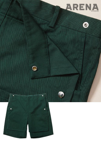‘반바지 앞치마’가 있다면 이런 모습일 것이다. 평범한 버뮤다 팬츠에 같은 바지 모양을 약간 축소한 천을 똑딱이 단추로 고정했다. 입고 서 있으면 잘 모른다. 이 반바지의 비범함을. 가격미정 분더샵 맨 판매.