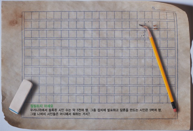 어릴 때 우리는 시를 읽으며 자랐다. 읽기도 했고 외우기도 했으며 그도 모자라 짓기도 했다. 수학경시대회에서 1등 하는 것만큼이나 백일장에서 동시를 지어 상을 타는 건 학교의 자랑거리이자 교무실 선생님들의 입방아에 오르내리는 학생이 되는 방법 일순위였다. 학창 시절에는 삼각함수를 풀기 전 서정윤의 ‘홀로서기’가 적힌 연습장 뚜껑을 먼저 열었고 공책 정리를 하기 전 책받침에 있는 윤동주의 ‘서시’를 먼저 읽었다. 얼굴을 달아오르게 하는 이성 친구에게 보내는 편지에는 ‘보여줄 수 있는 사랑은 아주 작습니다’(칼릴 지브란) 따위의, 내 마음을 기똥차게 은유적으로 표현한 구절들을 옮겨 보냈다. 유달리 감수성이 예민한 애들은 ‘문학의 밤’이라는 모임을 만들어 리처드 클레이더만의 음악을 틀고 생강차를 마시며 시를 낭송했다. 미술에 소질 있던 이들은 그림에 시를 곁들인 ‘시화(詩畵)’라는 장르를 교내에 퍼뜨렸던 것도 같다. 생각해보면 진짜 풍류를 아는 친구들이다.