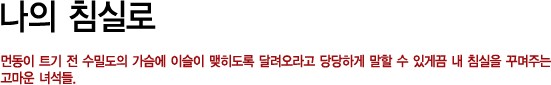 먼동이 트기 전 수밀도의 가슴에 이슬이 맺히도록 달려오라고 당당하게 말할 수 있게끔 내 침실을 꾸며주는 고마운 녀석들.<br><br>[2006년 8월호]