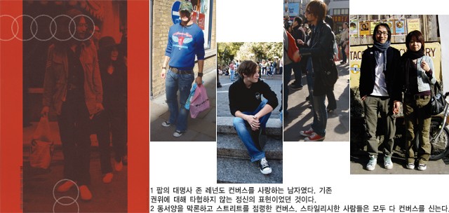 대량으로 기계에서 쏟아져 나오는 컨버스의 가장 좋은 친구는 아이러니하게도 장인의 손끝에서 빚어진 명품 수트라는 데 패션의 묘미가 있다. 또한 가장 ‘컨버스’스럽게 신는 방법은 컨버스를 ‘캔버스’ 삼아 자신만의 그림을 그리는 것이다. 일종의 리폼 과정인데, 요즘에는 수많은 컨버스 마니아들의 수준이 놀라울 정도다.