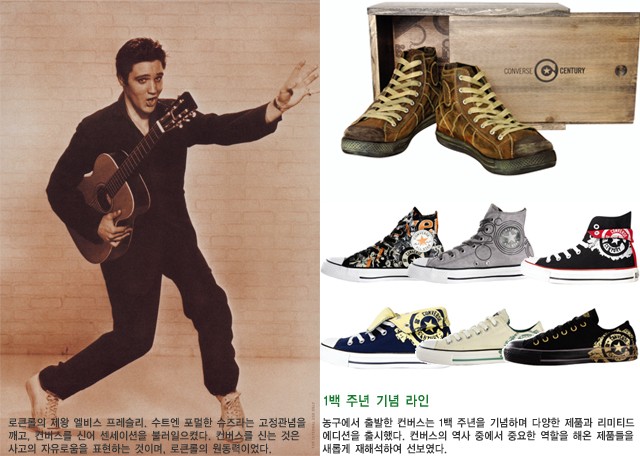 2008년은 컨버스가 탄생한 지 꼭 1백 주년이 되는 해다. 컨버스는 말 그대로 우리 곁에 ‘살아 있는’ 전설이기 때문에 - 그 전설은 박물관에 박제되어 있는 것이 아니라 아직도 날개 돋친 듯 팔려 나가는 현재 진행형이기에 - 구태의연한 헌정사를 바칠 필요성까지 느끼진 않는다. 하지만 만삭이 된 그레이스 켈리의 배를 가려준 켈리 백이나, 제2차 세계대전의 마침표라 여겨지는 디올의 뉴 룩처럼 값비싼 하이 패션이 아니라 남녀노소, 빈부를 가리지 않는 아이템이란 점은 그 가치를 극대화시키는 또 다른 이정표다.