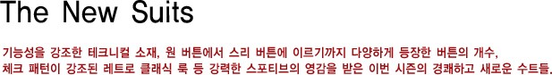 기능성을 강조한 테크니컬 소재, 원 버튼에서 스리 버튼에 이르기까지 다양하게 등장한 버튼의 개수, 체크 패턴이 강조된 레트로 클래식 룩 등 강력한 스포티브의 영감을 받은 이번 시즌의 경쾌하고 새로운 수트들.<bR><br>[2008년 2월호]