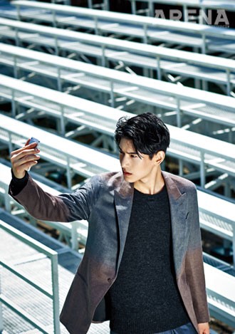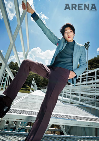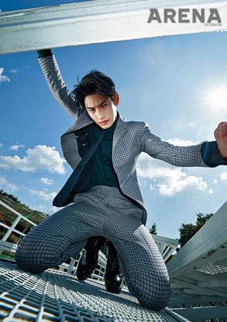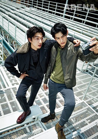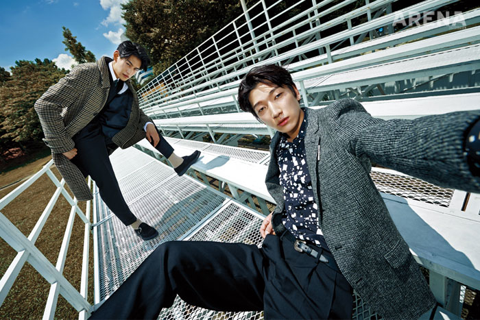 (오른쪽) 올리브색 헨리넥 티셔츠·가죽 블루종·회색 스웨트 팬츠·스웨이드 앵클부츠 모두 가격미정 보테가 베네타 제품.