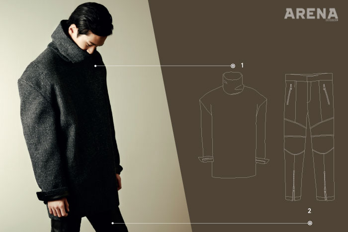 오버사이즈 터틀넥? 아니면 울 코트? 이 옷을 정의할 만한 적당한 용어가 떠오르지 않는다. 뒤쪽에 여밈이 있나 했더니 그마저도 없다. 그냥 풀오버 형태다. 다만 소매 끝 부분에는 코트처럼 버튼이 달려 있는 정도. 코트에나 쓸 법한 묵직한 울 소재라 입고 벗기도 쉽지 않다. 설명은 이쯤 해두고 어떤 옷과 매치할지 고민해보자. 어설프게 입는 것보단 디자인에 걸맞게 과감할 필요가 있다.