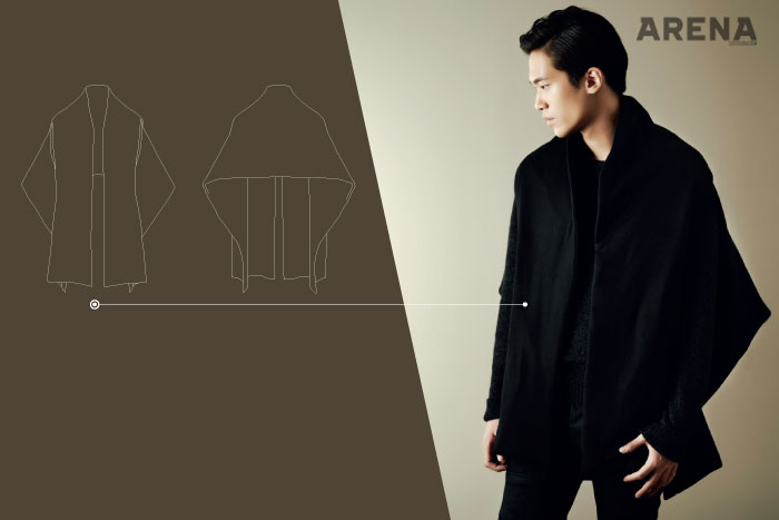 남자 옷에서 숄 형태를 찾기란 쉽지 않다. 영화 <친구>에서 유오성이 걸친 겨울 이불 느낌을 탈피할 자신이 없다면 시도하기 힘든 아이템. 그나마 이 숄은 모양새가 차분하고 다부진 면이 있어 시도해볼 만하다. 머플러 내리듯 앞쪽으로 가지런히 하면 숄이 아닌 것 같은, 그렇지만 무슨 옷인지는 모를 실루엣이 완성된다. 다소 민망할 수 있는 뒤태는 당신의 몫이다.
