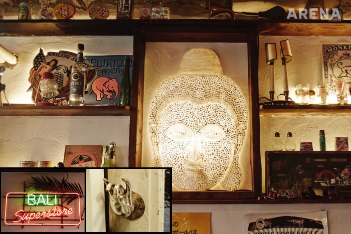 부처의 손을 비틀자 이국의 풍경이 펼쳐졌다. 발리 슈퍼스토어는 평소 여행을 좋아하는 주인장이 해외를 여행하며 직접 공수한 물건들로 꾸몄다. 입구에 있는 부처 손 모양 문고리는 인도에서 가져왔다고 한다. 뿐만 아니라 자비로운 빛을 뿜고 있는 부처 얼굴 모양의 조명은 인도에서 돌 하나하나를 이어 붙여 만든 것으로 특별히 주문 제작한 것이다. 이국적인 포스터, 자기 인형, 맥주컵 등 소품들 역시 귀하게 모아 신중하게 진열했다. 잘 만든 인테리어는 발품 팔아야 내 것이 된다.
