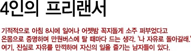 온몸으로 증명하며 만원버스에 탈 때마다 드는 생각. `나 자유로 돌아갈래.` 여기, 진실로 자유를 만끽하며 자신의 일을 즐기는 남자들이 있다.