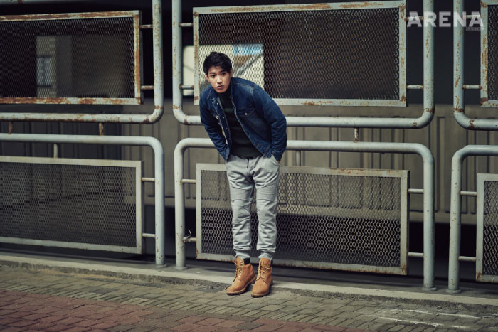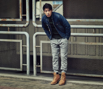 - 카키색 터틀넥 니트 가격미정 보테가 베네타, 청색 데님 재킷 13만8천원 칩먼데이, 절개 디테일이 더해진 스웨트 팬츠 46만원 마커스 루퍼 by 갤러리아 웨스트 4F, 투박한 워커 부츠 25만8천원 팀버랜드 제품.
