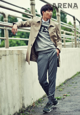 - 흰색 셔츠 가격미정 타임 옴므, 회색 스웨트 티셔츠 24만8천원 아페쎄, 회색 스웨트 팬츠 가격미정 보테가 베네타, 베이지색 맥코트 49만8천원 클럽 모나코, 카키색 운동화 11만9천원 아디다스 오리지널스 제품.