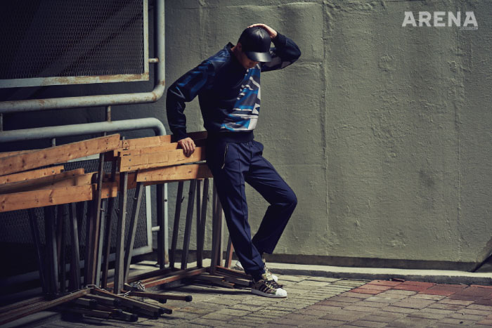 - 기하학 프린트가 그려진 네오프렌 소재 스웨트 티셔츠·감색 스웨트 팬츠·검은색 가죽 캡 모자 모두 가격미정 준 지, 카무플라주 패턴 운동화 9만9천원 아디다스 오리지널스 제품.