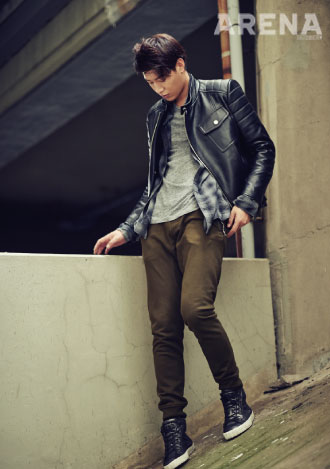 - 얇은 회색 티셔츠·체크 셔츠 모두 가격미정 올세인츠, 카키색 스웨트 팬츠 28만9천원 산드로 옴므, 검은색 라이더 재킷 98만원 커스텀멜로우, 지퍼 장식이 돋보이는 검은색 가죽 스니커즈 40만원대 아쉬 제품.