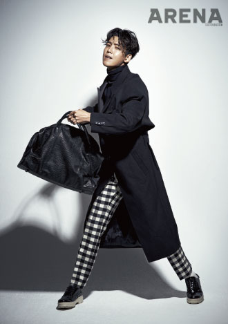 ▲ (왼쪽)검은색 오버사이즈 코트는 장광효카루소, 체크무늬 팬츠는 김서룡 옴므, 검은색 슈즈는 캠퍼, 가방은 링우, 검은색 터틀넥 니트와 흰색 양말은 모두 스타일리스트 소장품. (오른쪽) 검은색 벨벳 턱시도는 구찌, 검은색 슈즈는 캠퍼, 검은색 모자·검은색 커머번드·흰색 양말 모두 스타일리스트 소장품.