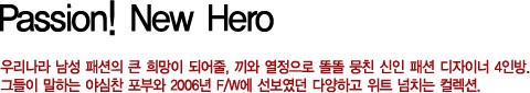 우리나라 남성 패션의 큰 희망이 되어줄, 끼와 열정으로 똘똘 뭉친 신인 패션 디자이너 4인방. 그들이 말하는 야심찬 포부와 2006년 F/W에 선보였던 다양하고 위트 넘치는 컬렉션.<br><br>[2006년 8월호]