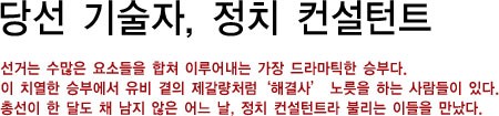 대한민국에서 ‘정치 컨설턴트’라는 직업은 아직 낯설다. 적어도 여전히 지겨워 죽겠는 빨갱이 정서와 지역주의로 얼룩진 현재의 정치 구도에선 어느 지역에서 어느 당의 공천을 받느냐는 것만으로도 승부가 결정되는 상황이다. 인물과 정책보다는 당파와 이념, 자신의 경제적 이익만을 중요시하는 유권자들의 ‘무지’ 탓이다. 정치 컨설턴트들은 이런 빈틈을 파고드는 사람들이다.