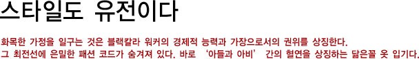 화목한 가정을 일구는 것은 블랙칼라 워커의 경제적 능력과 가장으로서의 권위를 상징한다. 그 최전선에 은밀한 패션 코드가 숨겨져 있다.바로 `아들과 아비` 간의 혈연을 상징하는 닮은꼴 옷 입기다.<br><Br>[2008년 4월호]