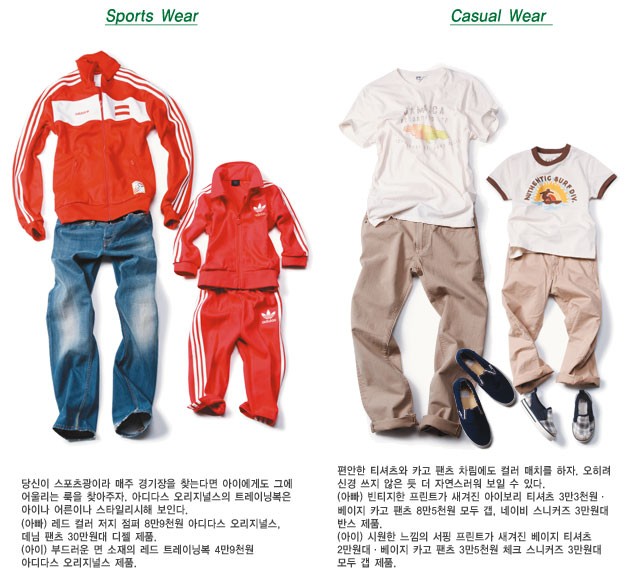 스포츠 브랜드로는 아디다스와 푸마가 대표적이며 캐주얼 브랜드로는 폴로와 갭, 그리고 타미 힐피거, 라코스떼 등을 알아두어야 한다. 특별한 날 당신의 아이와 함께하고 싶다면 버버리나 디올 키즈도 좋다. 이제 더 이상 사지도 못할 자동차 제원표는 던져 버리고 당신의 아이와 함께할 패션 카탈로그를 뒤져보자.