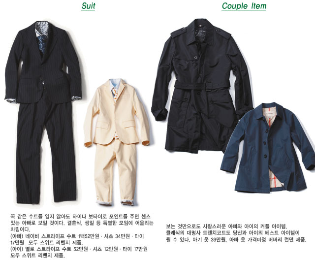 이 시대 아버지의 표상은 무엇일까? 기무라 타쿠야나 브래드 피트처럼 화목한 가정을 꾸리면서도 스타일리시한 남자. 결혼한 사실을 숨기고 다른 여성과 데이트하기보다 가족과 함께 어딘가로 놀러 가는 모습이 훨씬 더 멋져 보인다는 것이다. 하지만 육아에 흥미는 있지만 부끄러워 주저하는 남성이 아직 많은 것이 현실이다. 아빠들도 이제 자동차나 패션과 같이 육아 용품에도 관심을 가져야 할 때다. 요즘 특히 아빠와 아들이 같은 룩을 입는 것이 트렌드다. 엄마와 딸이 주로 행하던 이러한 모습은 육아에서 아빠의 역할이 점점 중요해지면서 자연스럽게 확대되고 있다. 그에 발맞춰 많은 브랜드들에서 아빠와 아이가 함께 입을 수 있는 패밀리 룩을 잇따라 출시하고 있다.
