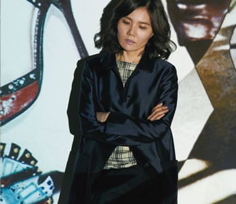 체크무늬의 보트넥 블라우스· 편안한 실루엣의 검은색 팬츠 모두 아페쎄, 새틴 소재의 싱글 코트 로리엣 제품.