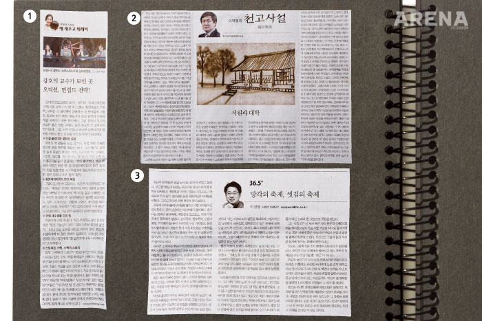 ‘텔레비전’이 아니라 ‘테레비’다. 맘대로 쓰겠다는 의지가 제목에서 느껴진다. ‘애’ 재우고, 텔레비전 보면서 든 이런저런 상념을 적는다. 그런데 일기는 아니다. 특히 최근 실린 ‘강호의 고수가 모인 곳 오디션, 면접도 전략’은 제목이 영 앞뒤가 안 맞는 문장 같지만 글은 꽤 실용적이다. <슈퍼스타K 6>의 오디션을 면접과 연관시킨다. 오디션에 붙는 전략을 면접의 전략으로 응용한 것이다. 마지막 문장이 이렇다. ‘그러게, 원래 세상은 공평치 않다.’ 신문에서 이런 문장을 읽다니. 신문은 만날 거짓말만 하는 줄 알았는데 현실과 사실을 적고 있다. 한 달에 한 번 혹은 두 번, 예고 없이 동아일보.