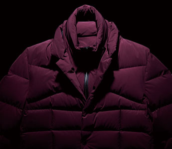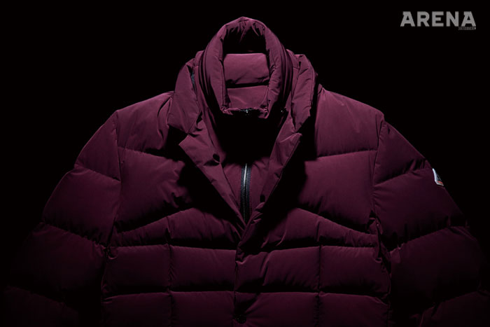 ▲ 스트레치 소재를 사용해 착용감이 편안한 와인색 패딩 재킷. 칼라 부분에 이너 패딩을 덧대 목까지 잠기는 디자인이 보온성을 높여준다. 울트라 스트레치 라이트 다운 재킷 95만원 랑방 스포츠 제품.