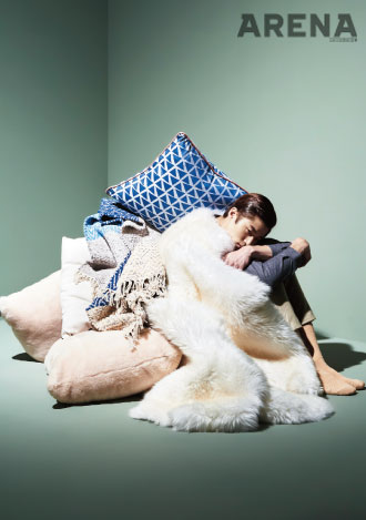 (위부터) 빛바랜 바다색 쿠션 4만9천원 시타 디자인 by 까사미아, 부드러운 베이지색과 파란색 블록을 조합한 복고풍 러그 4만9천9백원 자주, 캔버스 소재의 납작한 쿠션 5만9천원 안데르스 by 까사미아, 풍성한 양털 가죽 러그 39만원·짧은 양털 가죽 쿠션 중형 18만5천원·대형 30만원 모두 어그 제품. + 회색 펠트 소재 셔츠·베이지색 팬츠 모두 가격미정 코스 제품.