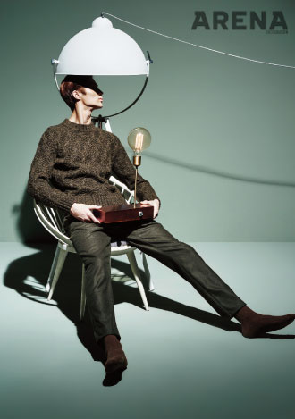 (위부터) 풍성한 빛을 비추는 큼직한 플로어 램프 볼 90만원 캐어, 빗살 무늬로 동그랗게 나열된 가는 나무 프레임의 이지 체어 가격미정 메종, 봉긋 솟아오른 램프의 광량을 부드럽게 조절할 수 있는 테이블 스탠드 8만5천원 세컨드문 제품. + 짙은 올리브색 스웨터 가격미정 더 쿠플스, 짙은 올리브색 울 소재의 바지 가격미정 코스 제품.