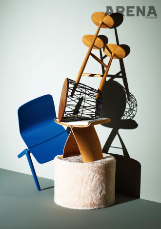 2개의 구부러진 원목을 연결해놓은 디자인의 윙 스툴 14만2천원 퍼니매스, 선명한 파란색을 입힌 원목 체어 43만원 라꼴렉뜨, 짧은 양털 가죽으로 이뤄진 큼직한 라운지 스툴 60만원 어그 제품.