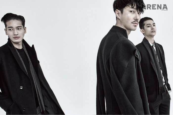 (왼쪽부터) 검은색 오버사이즈 코트 가격미정 까르뱅 at 쿤, 검은색 라운드넥 니트 87만원 아이스버그 at 쿤, 회색 바이커 데님 팬츠 가격미정 발망, 물방울무늬 머플러 가격미정 생로랑 제품. 머플러 장식의 짙은 회색 오버사이즈 코트 가격미정 에르메네질도 제냐 제품. 숄칼라 턱시도 수트·검은색 스카프 모두 가격미정 생로랑, 흰색 셔츠 72만5천원 빅터 앤 롤프 at 쿤, 팬츠에 장식한 체인 가격미정 크롬하츠, 검은색 타이 스타일리스트 소장품.