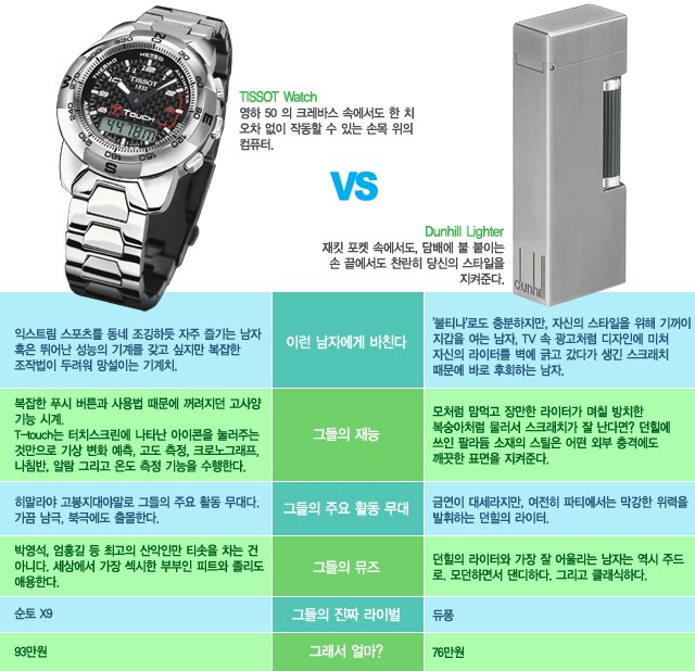 1백 년 뒤 인류의 생존 여부에 대해 확신할 수 없다는 스티븐 호킹의 우려가 아니어도, 지구는 황폐해져가고 있다. 그 어느 때보다 급속히…. 이제 튼튼한 것들이 최고로 대접받는 세상이 되었다. 물건도 마찬가지다. 나날이 잔인할 정도로 혹독해지는 환경으로부터 확실히 작동할 수 있는 걸물들이 속속 등장하고 있으니 말이다. 그렇다고 멋스럽지도 않은데 내구성만 뛰어나다고 덥석 지갑을 열어젖힌다면 평범한 회색칼라 워커- 블랙칼라 워커도 아닌 주제에 멋진 척 연기하는 족속을 일컫는 에디터만의 신조어다 - 와 뭐가 다르겠는가? 위의 기준에서 본다면 티솟의 T-touch와 던힐의 라이터는 우리 요구 조건을 훌륭하게 충족시킨다.