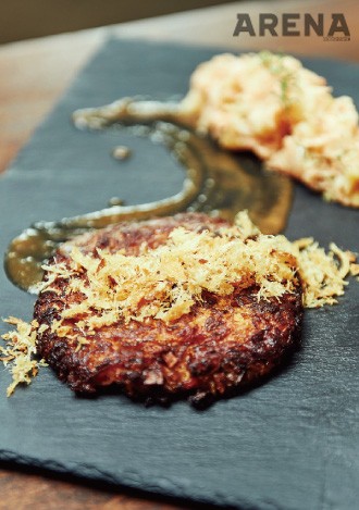 5 소스를 데워 접시에 바르고 스테이크와 매시드 포테이토를 올린다. 스테이크는 소스와 황태 가루로 매시드 포테이토는 딜로 장식한다.