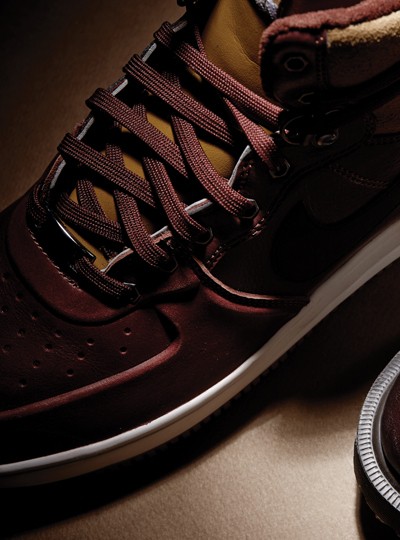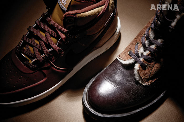 (왼쪽부터) 벽돌색과 겨자색이 어우러진 묵직한 디자인의 하이톱 스니커즈 18만원대 나이키, 날씬하고 매끈한 디자인에 양털 안감이 더해져 따뜻한 방한 부츠 가격미정 닥터마틴 제품.