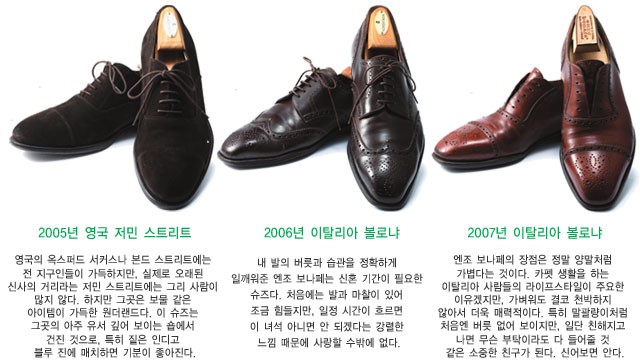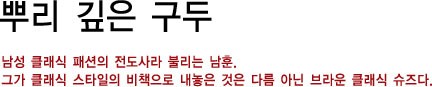 남성 클래식 패션에서 아이템이 아닌 사람을 돋보이게 하려면 아이템 간의 적절한 조화가 중요하다. 이러한 조화를 부드럽게 마무리해주는 것이 바로 슈즈다. 우리나라 남자들은 클래식 스타일에서 슈즈를 가장 나중에 고려하는 경향이 있다. 수트 이전에 선택해도 될 만큼 슈즈는 중요하다. 특히 남성의 클래식 슈즈는 패션이 아니라, 신는 사람의 정체성 그 자체이기 때문이다.
