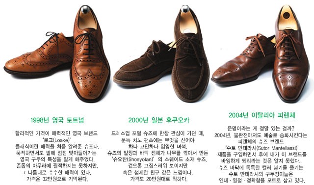 좋은 브랜드인가를 가장 먼저 따진다. 세계적으로 유명한 패션 하우스 브랜드를 말하는 것이 아니다. 전통 있는 슈즈 전문 브랜드인가, 정말 실력 있는 슈즈 장인이 만드는 브랜드인가를 가장 먼저 살핀다. 그리고 현재 소장하고 있는 슈즈 컬러를 감안하여 고른다. 클래식 슈즈 구입은 마치 가구 구입과 같다.