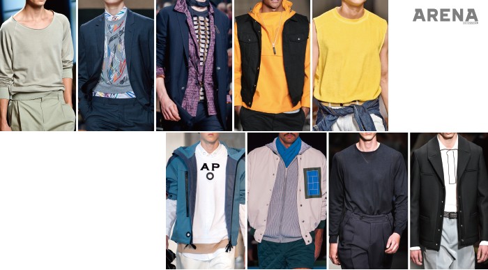 한마디로 ‘스포티즘의 승리’다. 스웨트 셔츠, 폴로 셔츠, 아노락, 느슨한 저지 티셔츠 등이 이번 시즌 상의 중 반 이상을 차지했기 때문이다. 중성적인 뉘앙스를 풍기는 보테가 베네타의 저지 티셔츠, 셔츠의 자리를 대신한 에르메네질도 제냐의 니트 폴로 셔츠, 컬러풀한 아미의 아노락, 유밋 베넌의 반소매 집업, 디올 옴므의 스웨트 셔츠 등이 그 증거. 재킷 안에 아노락이나 집업 점퍼를 레이어링한 경우가 유독 많았다. 이 범주 밖에서 눈길을 끌었던 건 칼라의 경계에 굵은 스티치를 넣은 프라다의 셔츠와 버버리 프로섬의 데님 트러커 재킷이다.