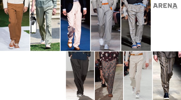 긴 바지가 주를 이루었다. 특히 밑위가 길고 통이 넉넉한 바지들이 상당수 소개됐다. 루스한 핏의 하의가 대세로 떠오른 건 이미 오래전. 하지만 실루엣의 변화가 눈에 띈다. 발목으로 갈수록 통이 좁아지는 배기 핏의 시대가 가고, 처음부터 끝까지 넉넉한 통을 유지한 일자형 바지의 시대가 온 것이다. 발렌티노의 파자마 팬츠, 꼬르넬리아니의 리넨 바지, 루이 비통의 면바지, 벨루티의 스웨이드 팬츠 등이 바로 그 예. 한편 묵묵히 소신을 지킨 컬렉션도 있다. 갈수록 타이트한 바지만 고집하고 있는 에디 슬리먼의 생로랑, 와이드 팬츠와 스키니 팬츠의 비율을 적절히 섞은 하이더 아커만이 바로 그것.