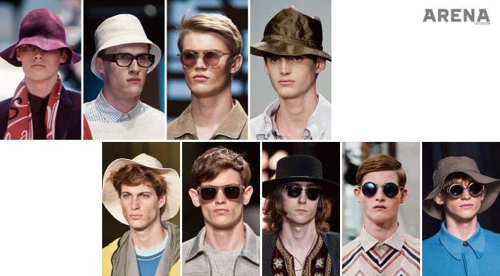 형태감이 유연한 버킷 해트가 상당수 소개됐다. 컬러풀한 펠트 소재의 버킷 해트를 선보인 버버리 프로섬이 대표적이다. 그 밖에 구겨진 듯한 소재감의 버킷 해트를 소개한 아이스버그, 챙이 짧고 단정한 모자를 수트에 매치한 까날리가 돋보였다. 페도라 역시 심심치 않게 눈에 띈다. 조르지오 아르마니와 아그네스 비는 여름 소재의 페도라를 선보였고, 생로랑은 곳곳에 검은색 펠트 페도라를 활용해 보헤미안 룩의 무드를 고조시켰다. 선글라스의 키워드라면 단연 ‘레트로.’ 브리지 부분을 ‘X’자 형태로 디자인한 루이 비통, 굵고 네모난 뿔테 선글라스를 선보인 닐 바렛 등이 대표적.