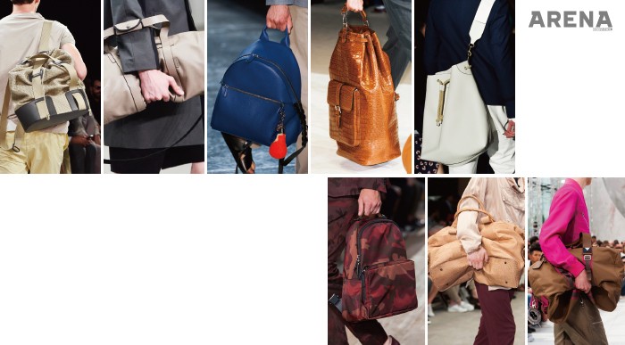 다양한 형태의 빅 백이 압도적으로 많았다. 매끈한 원통 모양의 빅 백을 선보인 까르뱅, 기하학 패턴과 이그조틱 가죽 소재를 사용해 존재감을 드러낸 드리스 반 노튼의 가방, 스포티한 느낌의 루이 비통이 그 예. 허리와 팔 사이에 끼워 드는 방식까지 비슷했다. 복주머니처럼 생긴 버킷백 역시 눈에 띄었는데 보테가 베네타와 구찌, 준 지, 조르지오 아르마니 등에서 찾아볼 수 있었다. 백팩의 등장 역시 주목할 만했다. 아미와 루이 비통, Y-3, 베르사체는 스포티한 백팩을 선보였고, 펜디와 발렌티노는 얌전한 백팩을 토트백처럼 활용해 눈길을 끌었다.