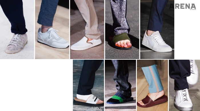 에스파드리유와 구두의 힘이 약한 시즌이다. 구두의 명가 벨루티마저 스니커즈로 런웨이를 채웠을 정도니까. 그중에서도 장식 없이 말끔한 흰색 스니커즈의 활약이 두드러졌다. 루이 비통과 아미, 까날리, 에르메스, 에르메네질도 제냐 등이 이를 활용해 세련된 스포티즘 무드를 완성했다. 한편 놈코어 스타일의 연장선으로 해석할 수 있는 슬리퍼의 유행이 이어졌다. 군더더기 없는 발렌티노와 크리스 반 아쉐의 가죽 슬리퍼, 라프 시몬스 버전의 아디다스 슬리퍼, 투박한 밑창과 정갈한 타이포그래피가 대조를 이루는 안드레아 폼필리오의 슬리퍼가 그 증거다.