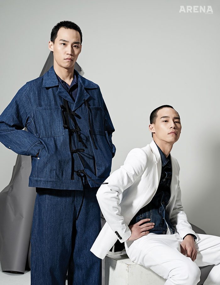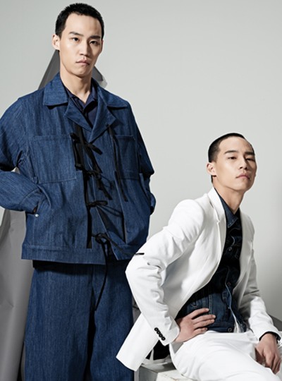 (왼쪽) 끈으로 여미는 데님 재킷 88만원·통이 넓은 데님 팬츠 78만원 모두 크레이그 그린 by 10 꼬르소 꼬모, 남색 셔츠 가격미정 준 지 제품.