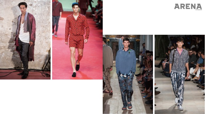 파자마에서 영감을 받은 듯한 옷들이 많았다. 미끄러지는 듯한 촉감의 섄텅 실크, 자연스럽게 배어나는 광택, 바람에 쉽게 펄럭이는 가벼움이 실크 파자마를 연상시켰다. 가장 그럴듯했던 건 발렌티노 컬렉션이다. 만개한 꽃 혹은 꽃망울 패턴의 실크 셔츠, 재킷, 아우터 등이 차례로 등장했다. 특히 편안한 실루엣의 파자마 바지가 눈길을 끌었다. 실크나 벨벳 같은 소재를 자주 활용하는 하이더 아커만 역시 이러한 무드를 풍겼다. 다른 점이 있다면 퇴폐적인 아름다움을 더했다는 것. 오묘한 색감의 실크 로브에 새틴 베스트와 늘어진 티셔츠, 스키니 바지를 매치하고 스카프를 두른 차림은 하이더 아커만이 아니라면 할 수 없는 발상이다. 그 밖에 폴 스미스와 드리스 반 노튼은 느슨한 새틴 수트를, 돌체&가바나는 물방울무늬의 파자마 셔츠를 소개했다.
