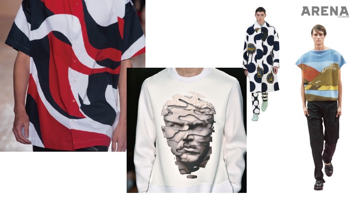 그림 같은 옷들이 존재감을 드러냈다. J.W. 앤더슨은 평면적인 풍경을 담은 니트 티셔츠로 컬렉션의 문을 열었고, 지방시는 흐드러진 안개꽃 패턴에 진주를 더한 화려한 룩을 마지막 순서로 정했다. 모두 하나의 작품이라 해도 손색없었다. 추상화 비슷한 프린트도 다수 등장했다. 곡선 구성 작품을 옷에 덮어씌운 듯한 알렉산더 맥퀸, 얼굴만 한 크기의 도트를 전면에 장식한 겐조, 음식 사진을 마치 팝아트처럼 반복적으로 활용한 에트로, 석상을 3D 프린트로 해체한 닐 바렛, 다중 노출을 통해 여러 겹으로 보이는 꽃무늬를 옷에 적용한 브리오니, 각국의 국기를 재료로 요란한 팝아트를 선보인 모스키노 등이 여기 해당한다.