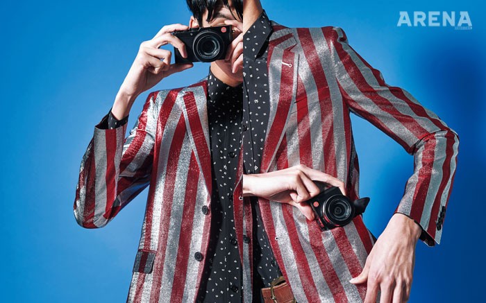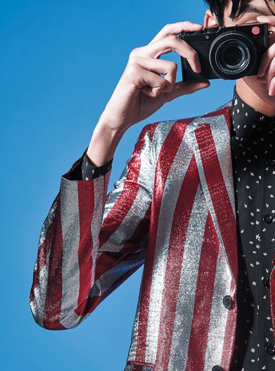 - 반짝이는 빨간색 줄무늬 재킷 가격미정·작은 무늬로 덮인 검은색 셔츠 1백24만원 모두 생로랑 제품.